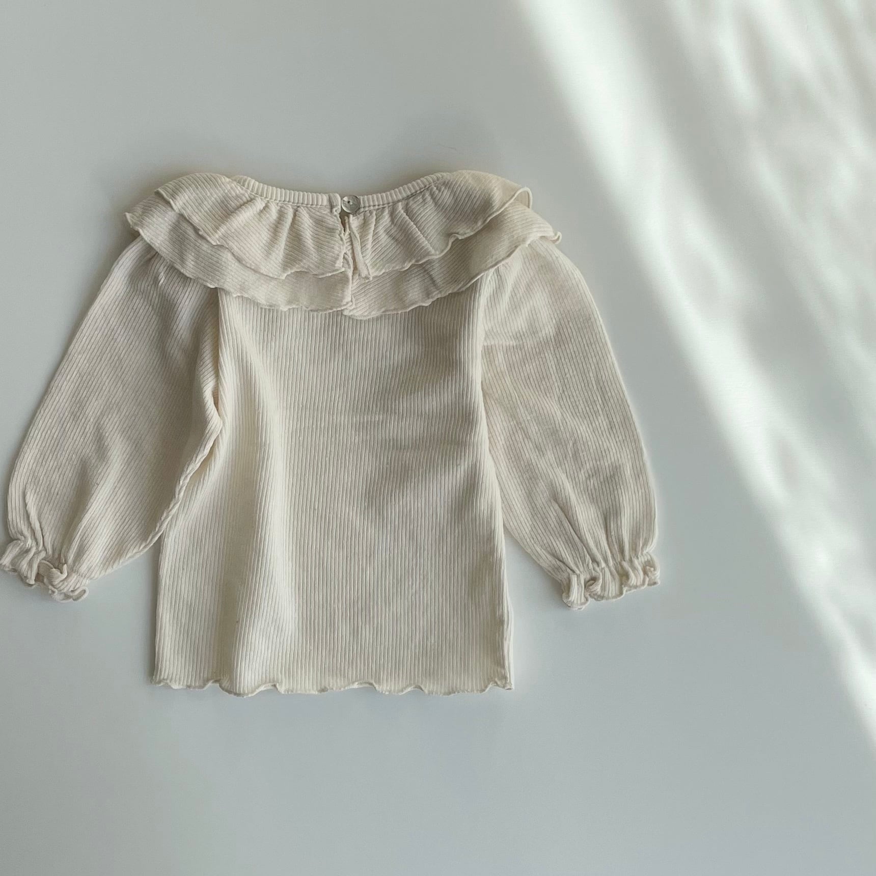 大きめのフリル襟が目を惹く